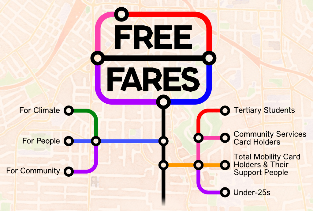We are asking for free public transport across all of Aotearoa, at all hours and days, for the following groups: